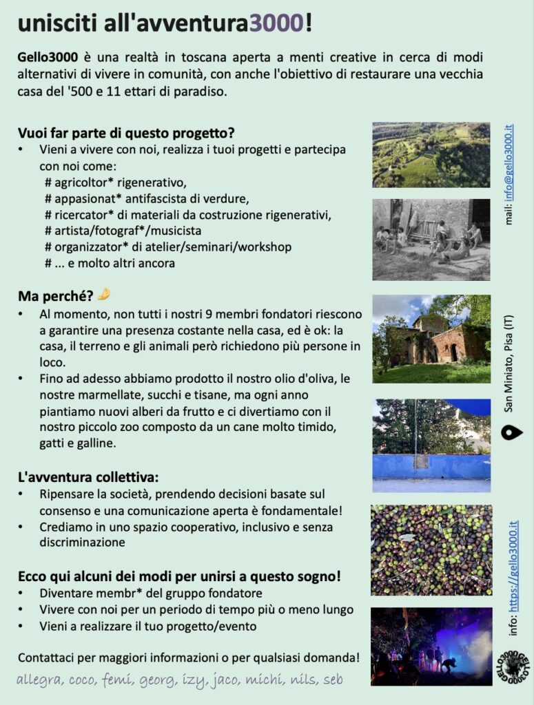 Nestled in the Sanminiatesi hills in Tuscany, the Gello3000 farm has decided to open its doors to new people interested in a collective experience. There are 9 of us in the collective but currently only 2-4 people live here full or part time. Since the place is big and there is a huge potential we are looking for motivated people who want to jump into farming, green building or just living the collective, self-managed experience.