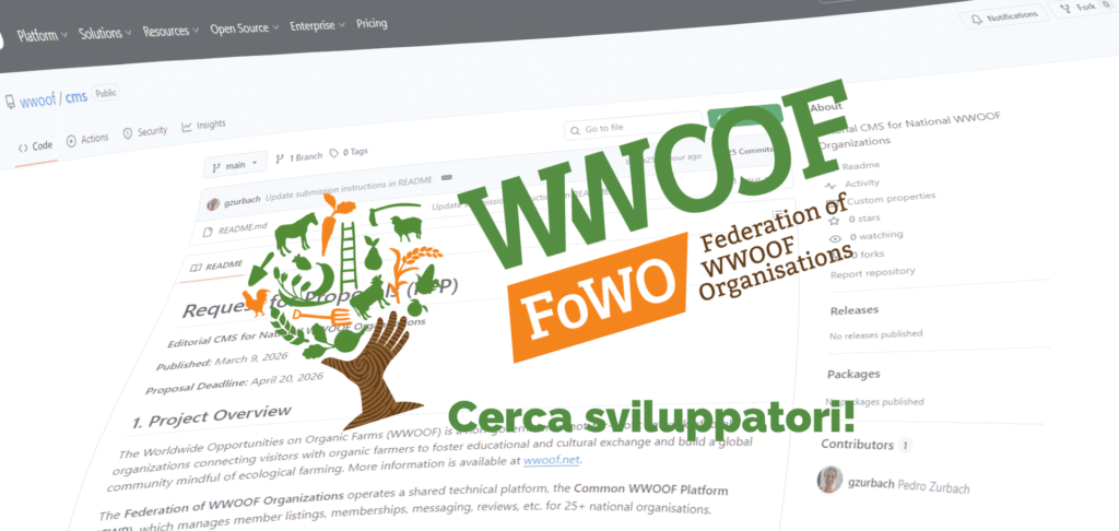 Candidature Aperte: Sviluppo del nuovo WWOOF CMS Segnaliamo un'importante opportunità professionale rivolta a sviluppatori senior, agenzie e realtà tecnologiche della nostra rete. La Federazione delle Organizzazioni WWOOF (FoWO) ha pubblicato una Request for...