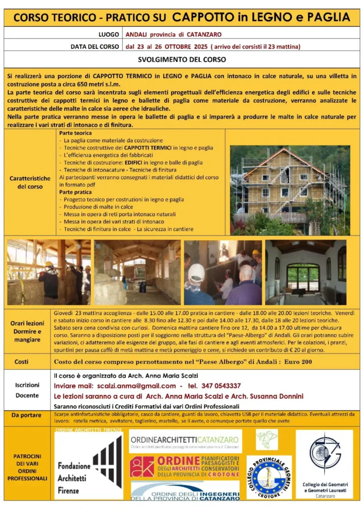 Home Events - WWOOF Italia corsi Dalle nostre reti Cappotto in Paglia – corso teorico pratico Organizzatore Associazione Terra Semplice Telefono +39 3483823021 Email s.mattei60@gmail.com Sito web https://terrasemplice.wordpress.com/ Luogo Andali Andali, CZ Categoria corsiDalle nostre reti Maggiori Info Leggi Tutto footer2 Italiano Data Ott 23 - 26 2025 Expired! Ora Tutto il giorno Costo 200.00 € Cappotto in Paglia – corso teorico pratico Condividi questo evento X + Aggiungi a Google Calendar + esporta iCal / Outlook Tags: andali, cappotto in paglia, cappotto termico, corso