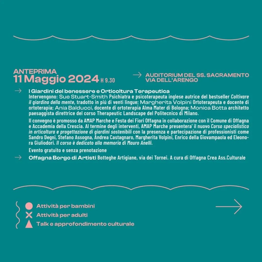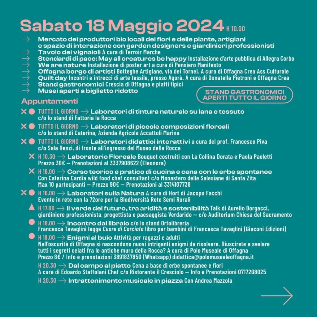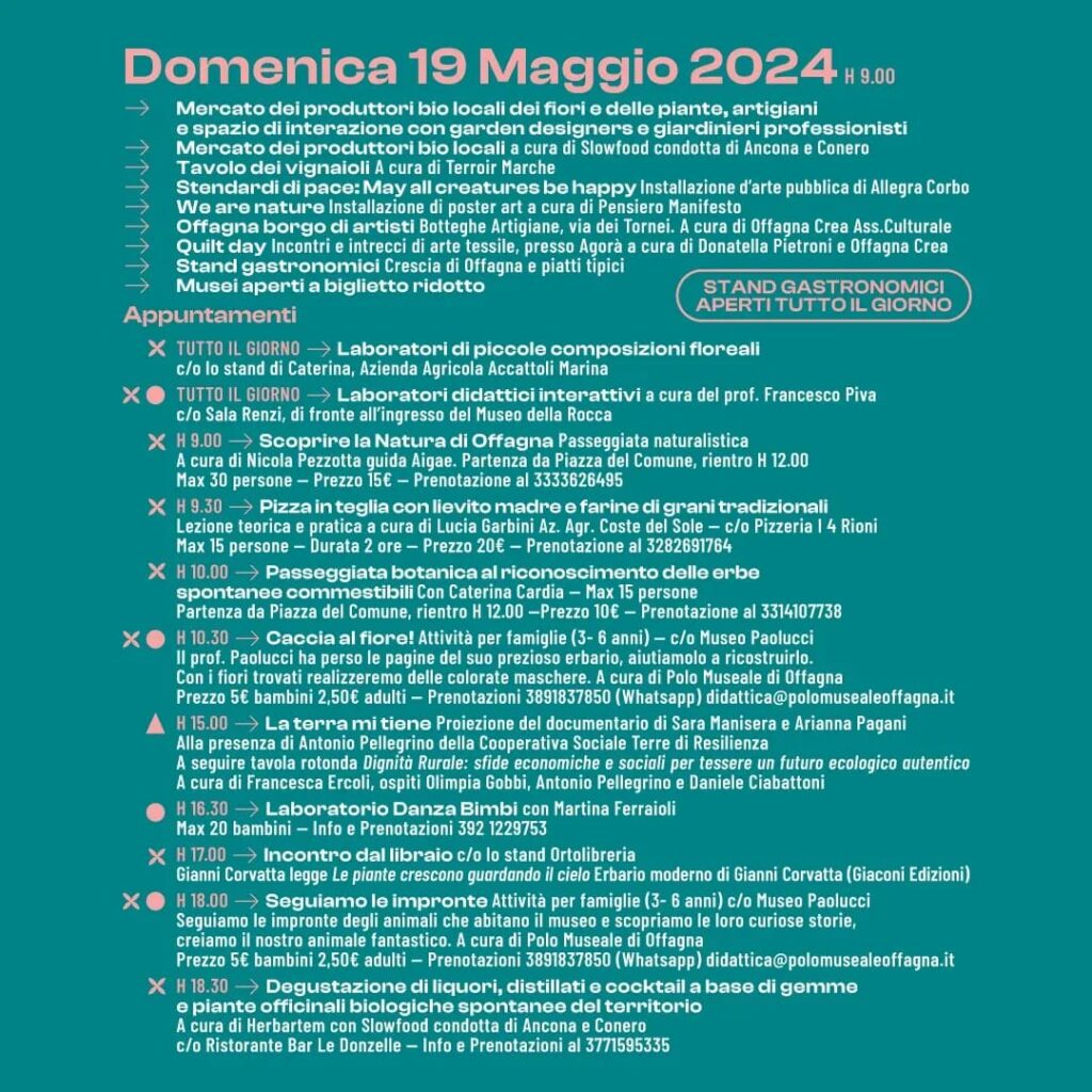 Due  giorni di mercato, eventi espositivi divulgativi e formativi, raccontano il meraviglioso mondo della natura e della biodiversità: fatto di piante e di fiori, spontanei ma anche coltivati in modo rispettoso e rigenerativo per la terra, di cibo contadino sano e pulito, di botanica e cosmesi, di artigianato, un mondo che si esprime attraverso l’arte e le storie di uomini e donne protagonisti di azioni significative e necessarie oggi come ieri. Racconti ed incontri, tra tradizione e innovazione, di professionisti e garden designers, artigiani e vignaioli, reti di produttori e contadini, tutti con sentimento affine di rispetto e tutela della Madre Terra, insieme ospiti del borgo di Offagna che unico svetta e abbraccia tutte le campagne dalla riviera del Conero ai Sibillini.