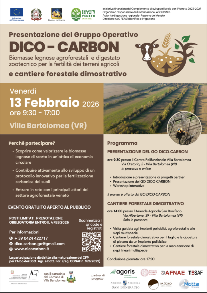 In un contesto di scarsa valorizzazione delle biomasse legnose residuali derivanti dalla gestione degli impianti arborei e arbustivi presenti nelle aziende agricole venete, una giornata di presentazione delle innovazioni proposte dal GO DICO-CARBON, attraverso un’occasione di focus tecnico e networking fra i portatori di interesse e gli operatori del settore.